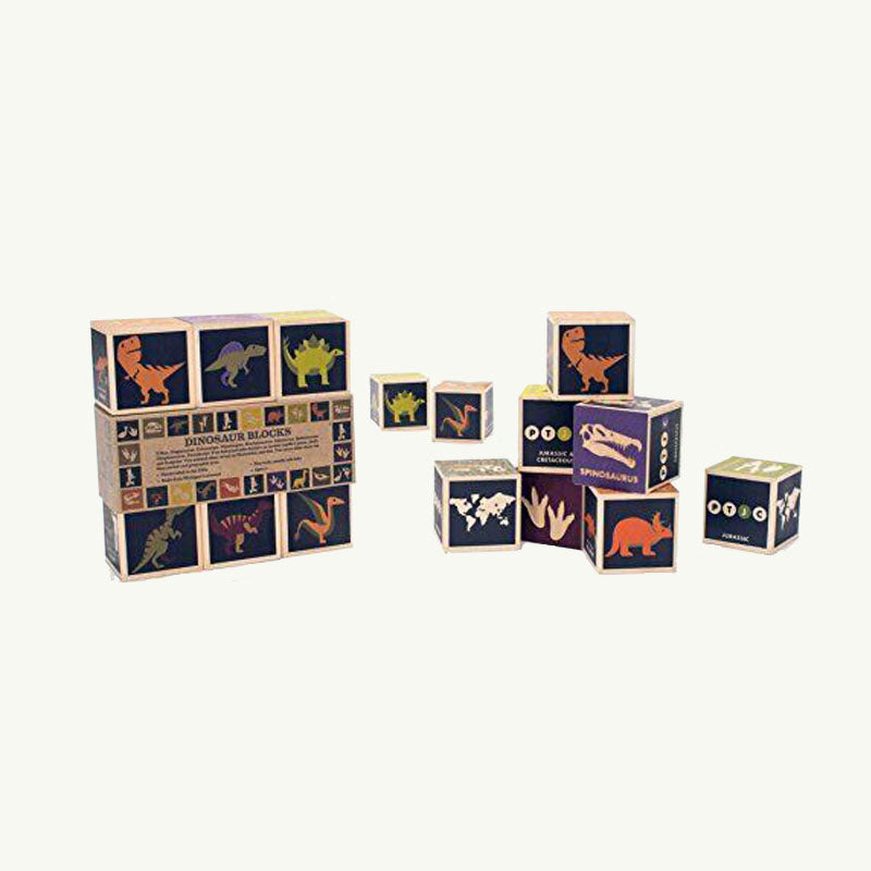 This 9 block set features 8 dinosaurs; plus a bonus reptile, the pterodactyl. The reptile drawings are friendly and colorful. The footprints? Fun to look at, fun to touch. The debossed skulls? Far from frightening, children find them particularly captivating. If you enjoy making footprints and skull prints in Play-Doh or modeling clay, these blocks are for you.