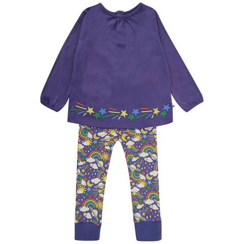 A lovely blue two-piece outfit. It features a stylish tunic top and leggings with a vibrant & fun cosmic weather print. The tunic top bares a lovely appliqué shooting star print around the base. It has popper openings on the back. The contrasting leggings covered in our cosmic-weather print, feature colourful rainbows, stars, clouds and more. It will add a fabulously playful pop of colour to your little ones wardrobe.