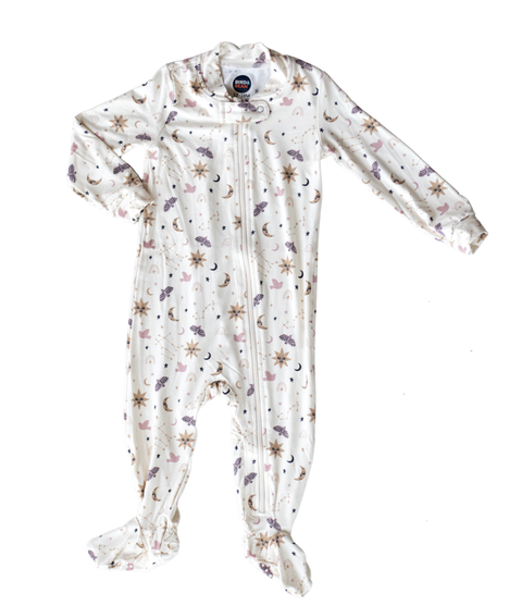 Cremalleras para poner y quitar fácilmente, ¡antideslizante en los pies! ¡Un bebé imprescindible! El estampado más lindo y la tela más suave (¡MÁS SUAVE!) hecha con una mezcla de modal y spandex. El modal está hecho de hayas y mantiene su forma, color y calidad lavado tras lavado tras lavado.