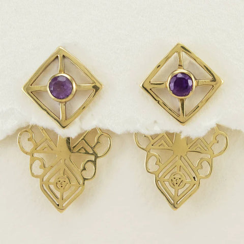 This geometric-style ear jacket includes Amethyst gemstones, said to open one's crown chakra to invoke a state of peace and tranquility. Hand-cast, hypoallergenic brass with sterling ear wires. Produced in Fair Trade workshop in India. Every Lunar Revolution earring is shipped with an evocative tag and plastic bebop for hanging on a rail system display. Earrings are finished with a safety earring backs.