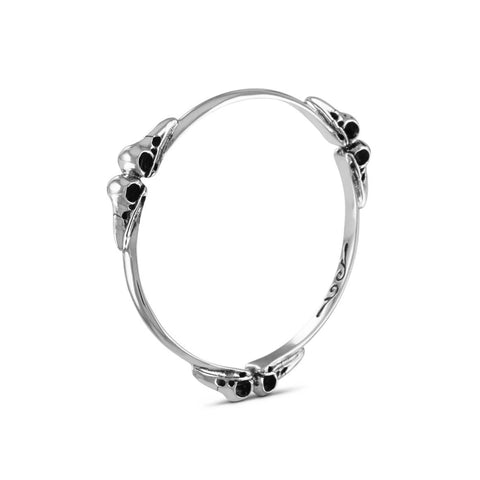 Seis calaveras de cuervo se sientan majestuosamente alrededor del brazalete en una contemplación silenciosa de Nevermore, cada una de las cuales da testimonio de esta vida y de la que ya pasó. Sólido, formidable, único. Hecho a mano en bronce blanco. diámetro: 64 mm.