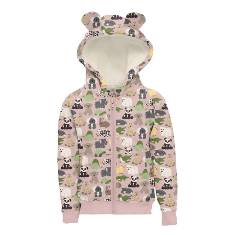 Winter chills be gone! Your little one will be toasty warm in this cozy bamboo fleece hoodie with extra cushy sherpa-lined hood and adorable animal ears. Our Kickee Bamboo Fleece fabric is 68% viscose from bamboo (organically and sustainably grown), 27% organic cotton, and 5% spandex, making it the perfect blend of softness, stretchiness and coziness. But that's not all! The jacket hood is lined with 100% polyester sherpa fleece for extra fluff, perfect to keep heads and ears warm. Pair this infant jacket with pants, shirts, and one-pieces in coordinating colors and matching prints for a complete look.