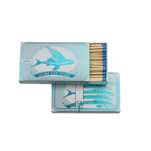 Bring the beach vibes to your next party with our Matchbox 4in - Flying Fish Sticks! This sardine can printed matchbook, featuring a flashy metallic finish, is just the thing to bring a spark to your night. Contains 4" matches, but don't worry - you won't have to catch your own!