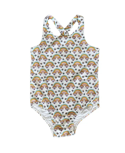 Get ready for the seashore, Sally! This adorable rainbow and seashell print is sure to bring some fun to those beach and pool days! Chemical-free, UPF 50, quick-dry fabric, keeping your little one safe and stylish while having some fun the sun!