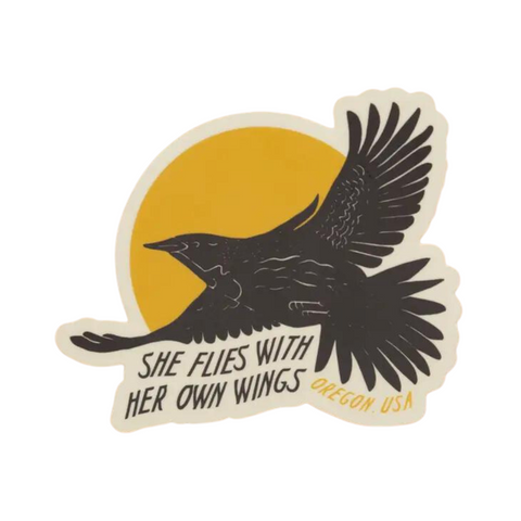 She Flies with Her Own Wings is Oregon's state motto. No matter which state you call home you can echo this fine sentiment. Design features a Western Meadowlark, the Oregon state bird. Die-cut 3.5" diameter, matte finished sticker. Produced with a special laminate that stays protected from exposure to wind, rain and sunlight.