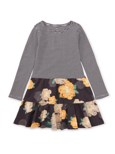 So sweet and sassy, this cute print mix dress combines such interesting design elements: two black-and-white stripe designs on top and gorgeous florals below. The fitted bodice and tiered skirt also bring together two complementary style elements. 100% cotton rib bodice and 100% cotton jersey skirt. Below mid-thigh length.