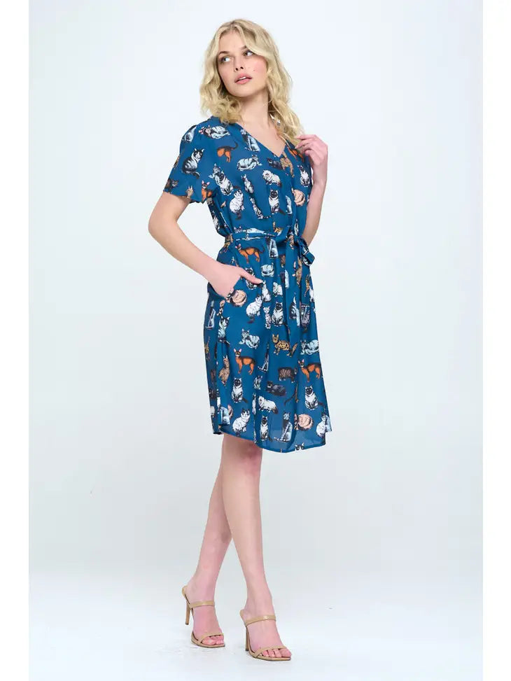 This beautiful blue dress features an all-over cat pattern, a comfortable tie-waist and an added pocket for all your essentials. Its delicate construction and tasteful details will make it a timeless wardrobe staple. Make any occasion extra special by wearing this luxurious dress.