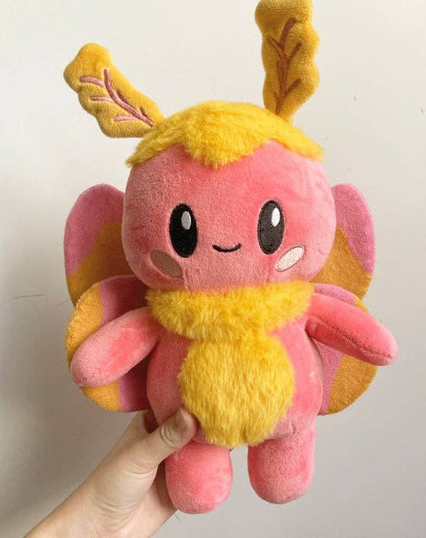 This Baby Rosy Maple Mothman Plush is 10 inches tall, and is made with pink and yellowminky fabric, along with yellow faux fur! Its wings have batting on the inside to keep it firm and upright, and its cute little booty is made via thread sculpting! Be sure to bring home Mothman and his friends!