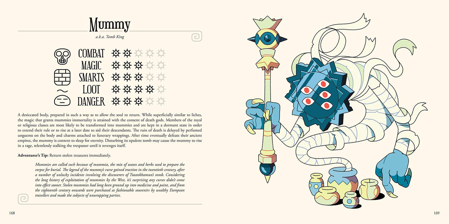Whether they’re beasts, spirits, demons, or even aliens, most fantasy worlds are filled with monsters. Some are harmless—many more are deadly. Luckily for the discerning adventurer, this book is here to help distinguish between the two. As a popular series sold at conventions and on Etsy, animators Blanca Martinez de Riuerro and Joe Sparrow have compiled three volumes into one deluxe edition. Each creature comes with a full-color illustration, a set of simplified statistics, a description, and a history section indicating its folkloric history and the scientific phenomena that may have influenced its creation. With creatures like the Archdevil, Dryad, Fire Bat, Gold Dragon, Smoke Devil, Bomb Plant, Ettin, and Spirit Fox, any tabletop player will find the perfect creature for their next campaign.