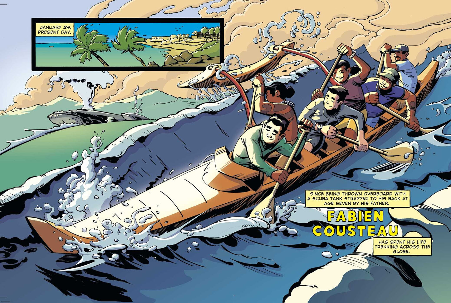 Fabien Cousteau came to Maui, Hawai’i for a vacation, but when he hears that endangered sea turtles are in trouble, he knows he has to help! Junior explorers Baylor and Bianca join Fabien and local conservationists on their mission to rescue these turtles from ghost nets—fishing nets that have been left adrift in the ocean and tangle up anything that strays into their path. During their dive, they’ll also encounter sharks, humpback whales, dolphins, seals, eagle rays, octopi, and the vibrant variety of wildlife that lives among the coral reefs of Molokini Bay. Can the team save these injured turtles in time?