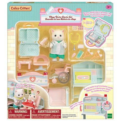 A doctor's office is opening in Calico Village! Convert the Red Roof Cozy Cottage and Family Picnic Van into a doctor's office and ambulance to tend to the needs of the families of Calico Village! Set includes Persian Cat Mother Dawn in her white doctor's coat and scrubs with stethoscope. Features hospital bed with mattress, wheelchair, set of crutches, doctor's briefcase and medical cabinet with medicine, bandages and more! Medical cabinet features "working" scan, simply push the button to receive test results!