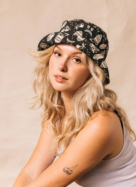 Being dead tired is a drag but this 55% hemp 45% organic cotton bucket hat covered in coffee and breakfast icons certainly is not. Features: 55% Hemp 45% Organic Cotton All Over Print L/XL (60 cm) Chainstitch Embroidery Adjustable Strap Brass Buckle Closure with Debossed Pyknic Logo Available in Rust Color One Size Fits All