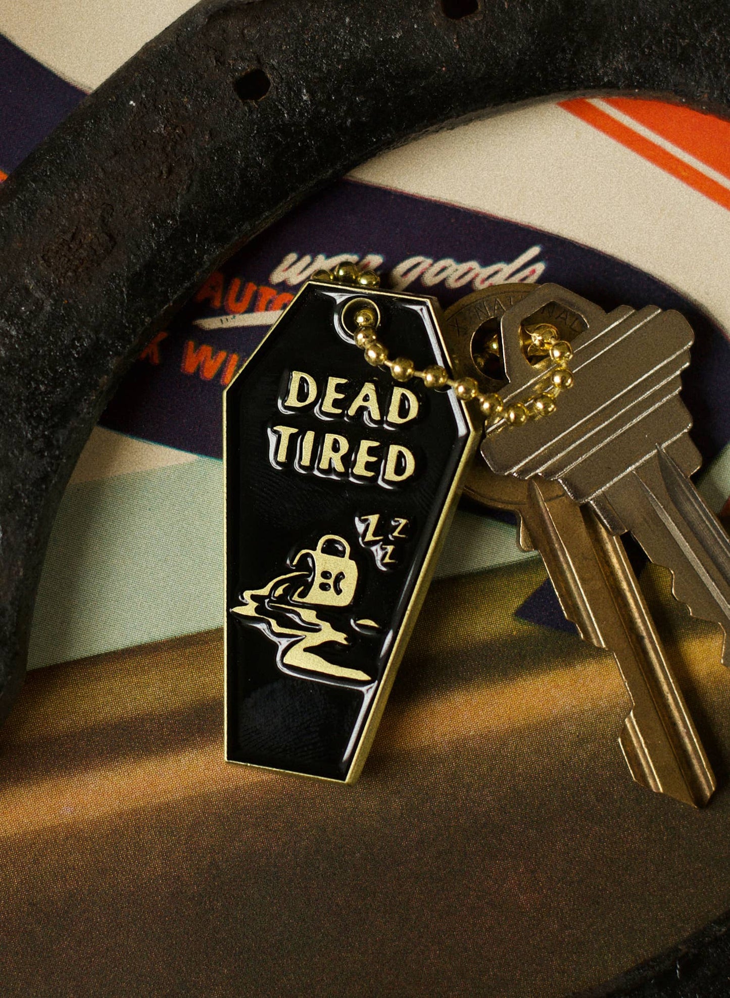 Our "Dead Tired" keychain features our fun caffeine / coffee slogan with a tired, sad broken mug spilling coffee on a coffin-shaped vintage brass colored metal keytag. It's the best coffee keychain gift for the coffee obsessed!