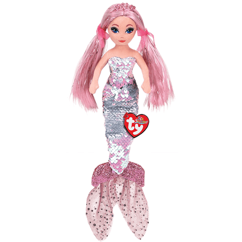 Pretty in silver and pretty in pink or mix them together whatever you think. I'm Cora the mermaid my sequins are fun. You can make me unique with a flick of your thumb. I have strands that sparkle in my long pink hair, my tail is glittery and the end is sheer. I wear a crown, my eyes are blue, I wish you'd take me home with you.