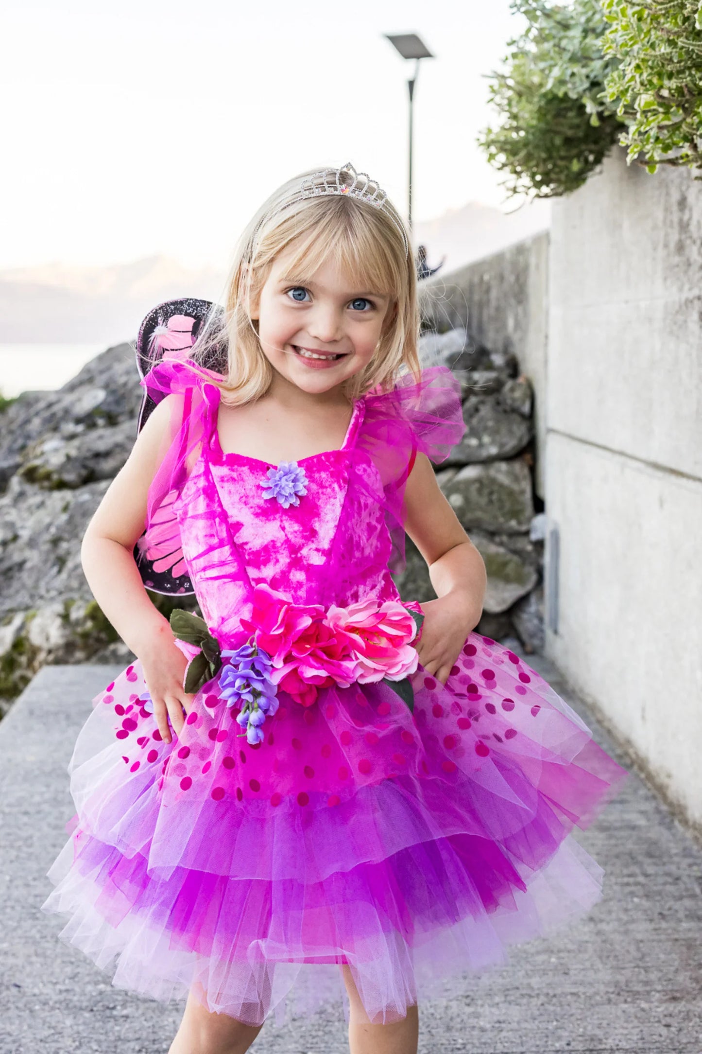 Our Fairy Blooms Deluxe Dress & Wings is now available in a beautiful new colourway! This dress is made with a crushed velour bodice and printed tulle skirt made from layers of hot pink and purple-colored tulle. At the waist, oversized large faux flowers and whimsical polka-dots adorn this fairy dress. This outfit would not be complete without matching detachable wings. Your little fairy will flutter around the garden in this extravagant new dress!