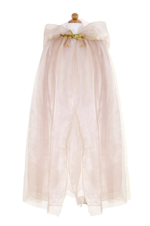 Our royal Princess cape is a delicate marriage of dusty gold and blush pink. A fine metallic lace is paired with soft pink organza, creating a storybook royalty feel. The oversized hood drapes elegantly with the paired fabrics. The cape easily Velcro's closed and features a glitter trimmed bow at the neck.