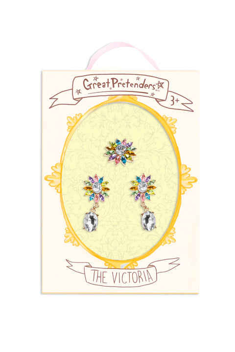 An addition to our extravagant jewelry set: The Victoria! This 3 piece jewelry set includes clip on earrings and a matching ring. It is made with vibrant pink, blue, green, and purple jewels that will make your little one feel like royalty! Not only is this jewelry set extravagant, but it also comes in a beautiful box with magnetic closure that can be repurposed to store all of your kiddos' extravagant jewels. Make your little one feel extra special with these royal jewels!