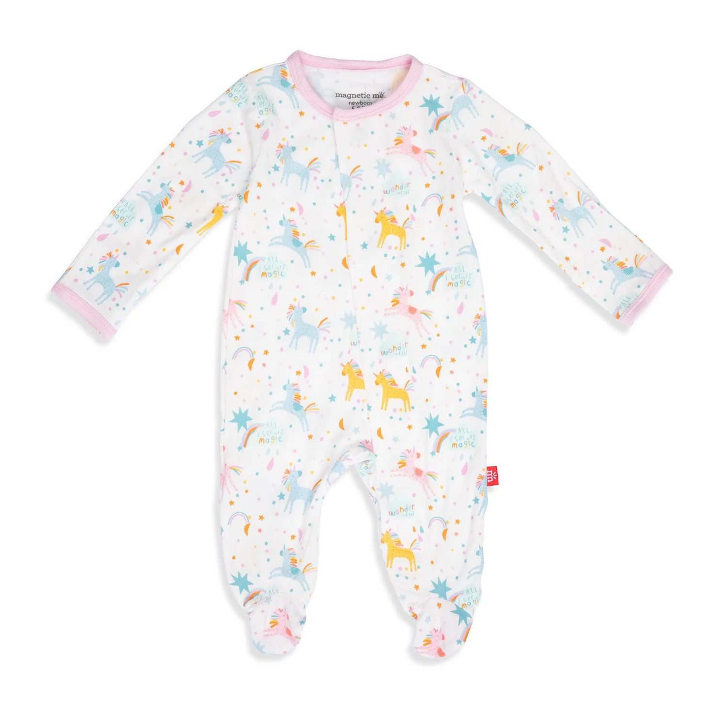 - magnetic closures: magnets line the seam from the neck to upper thigh for sizes up to 0-3m & from neck to crotch for sizes 3-6m and up.