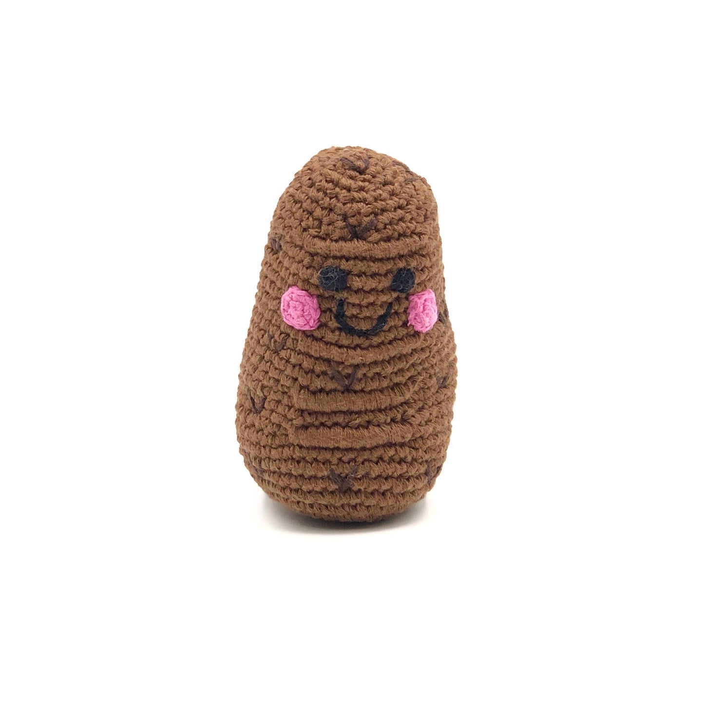 Hand-stitched with dark brown cotton yarn, this Friendly Potato Rattle has a sweet little smile and round pink cheeks. Pairs well with Pebble's Friendly Fruit and Veggie Collections.