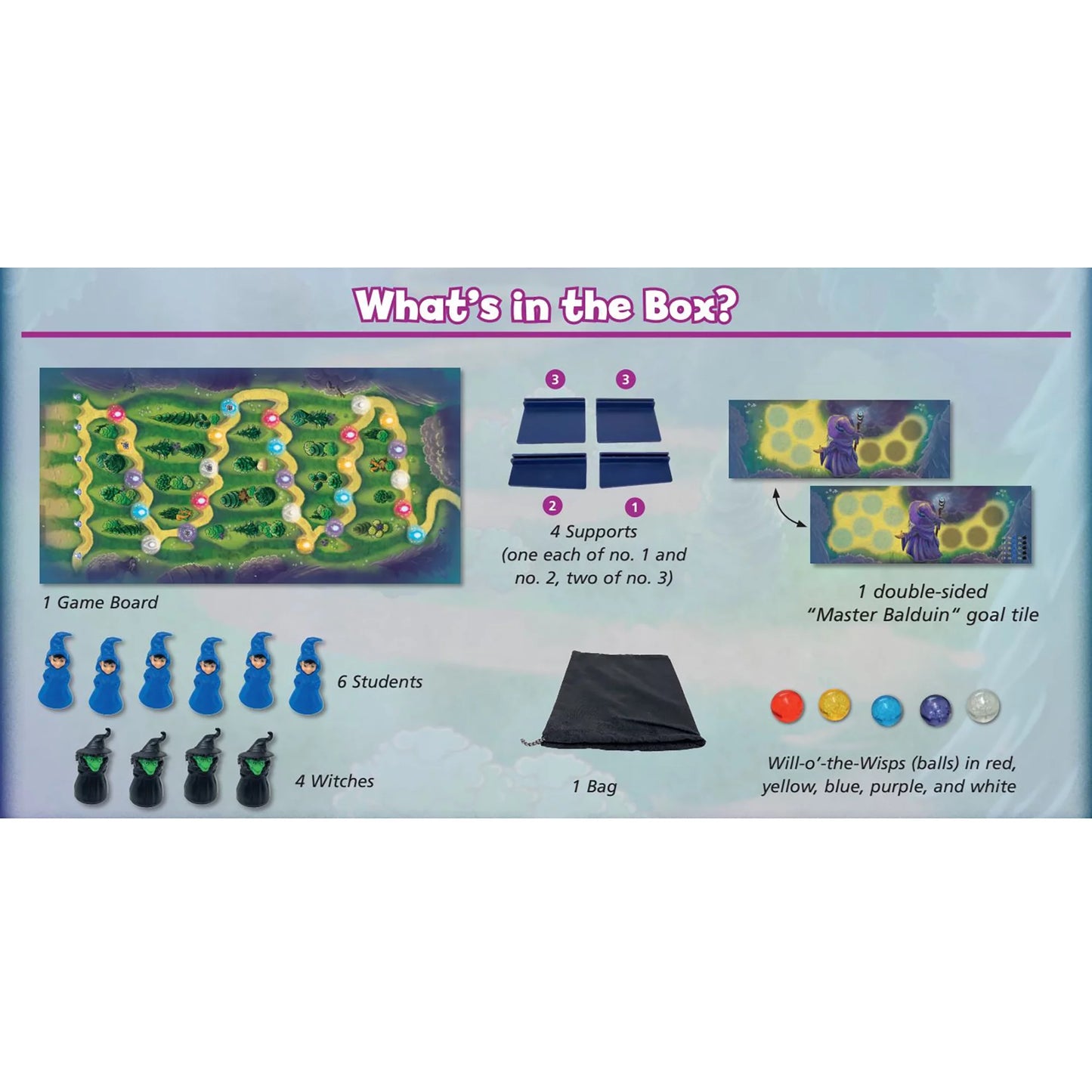To set up, place supports on the game board to elevate the starting area, then place six sorcerers' apprentices in the back row and four witches on their designated starting spaces. Add the five colored will-o'-the-wisp marbles to the bag.