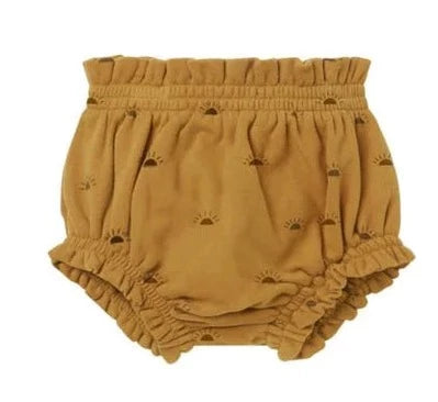 Gathered bloomers in our velvety soft organic brushed jersey. Elasticized waist and leg openings.