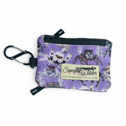 These cute little jumping spiders are ready to hop into your heart! Several species creep, crawl and jump across a purple background. This two-sided little wallet is just what you need to keep it light and carefree. Two zipper pockets on opposite sides to hold your change, cards or keys. There is also a small zipper pocket on the inside. The included S-Biner clip will make for quick clipping to a bag or your belt loop. Easily slips in your back or front pocket for fast access.