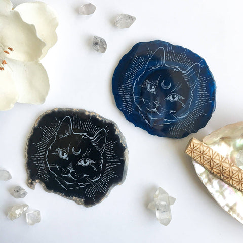 This adorable and mystical kitty cat is engraved onto the surface of the agate. This makes the perfect gift for any cat lover or Spooky Season enthusiast. All agates will come in randomly selected colors.