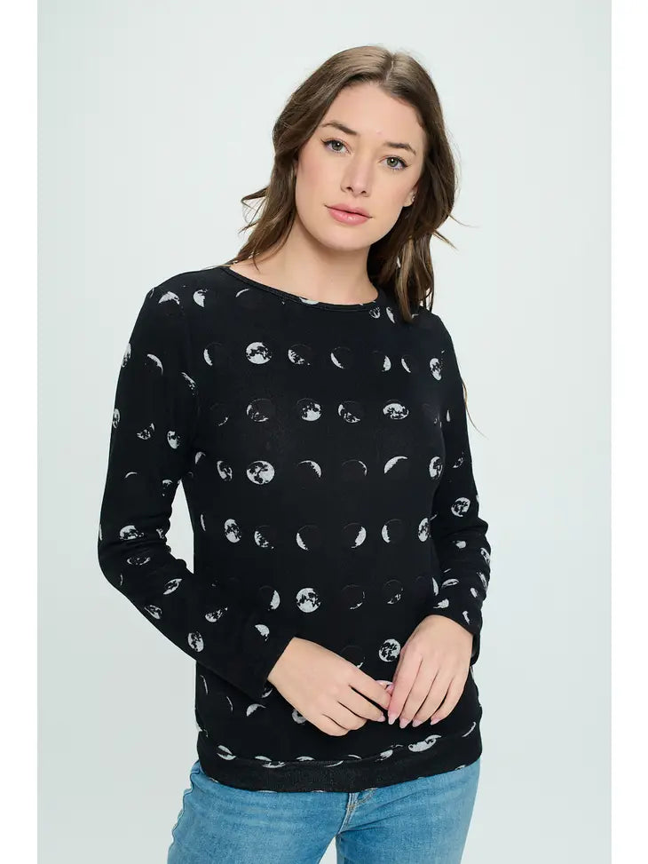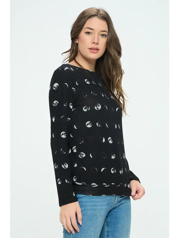 This luxury crew neck sweater offers a sophisticated look while also providing a comfortable fit. Crafted with a blend of soft, stretchy materials, this pullover sweater features an eye-catching black hue and a unique moon phase pattern. Enjoy the perfect combination of style and comfort with this chic and effortless piece.