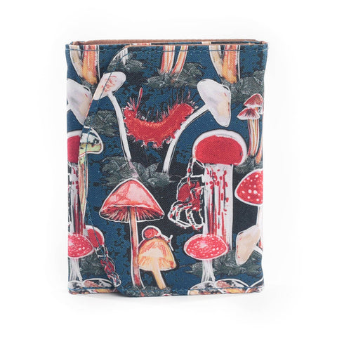 Cute little creepy crawlers climb, stretch and hang in a mushroom paradise. This style perfectly matches our Stride Crossbody , Sidetrack Crossbody and Venture Tote styles! -Measures 5.2 inches long x 3.75 inches wide x .75" deep -RFID blocking carbon layer to protect your information. (RFID crime is extremely rare) -2 sleeves for cash, receipts, etc. -Zip change compartment -10 card slots and clear ID slot -Made with 100% recycled water-resistant polyester and nylon. Magnetic Closure. 💧♻️