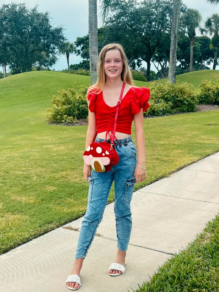 Groovy! Our new shiny mushroom bag is made of PU leather and comes with adjustable straps. Perfect to match any outfit and has a wide interior to hold your belongings safe and sound. Take it with you on errands or for a spontaneous night out with friends.