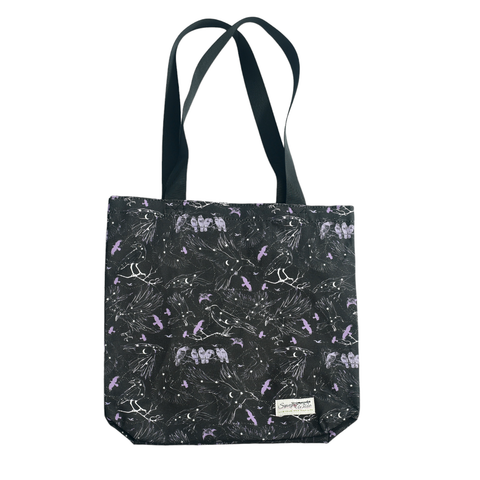 Commit to plastic-free shopping! Adorable reusable shopping bags in eye-catching prints! Includes gusseted structure and an inner pocket for your personal items! Cosmic Crows in lavender swirl, soar and perch with magical energy on a black background.