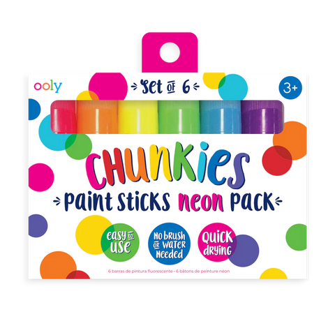 A neon set of Chunkies Paint Sticks in a travel-friendly pack of 6! These bright neon paint sticks are easy to hold and come in 6 outstanding neon quick drying colors. You twist up the barrels for long-lasting, mess-free fun that kids and adults alike will love.