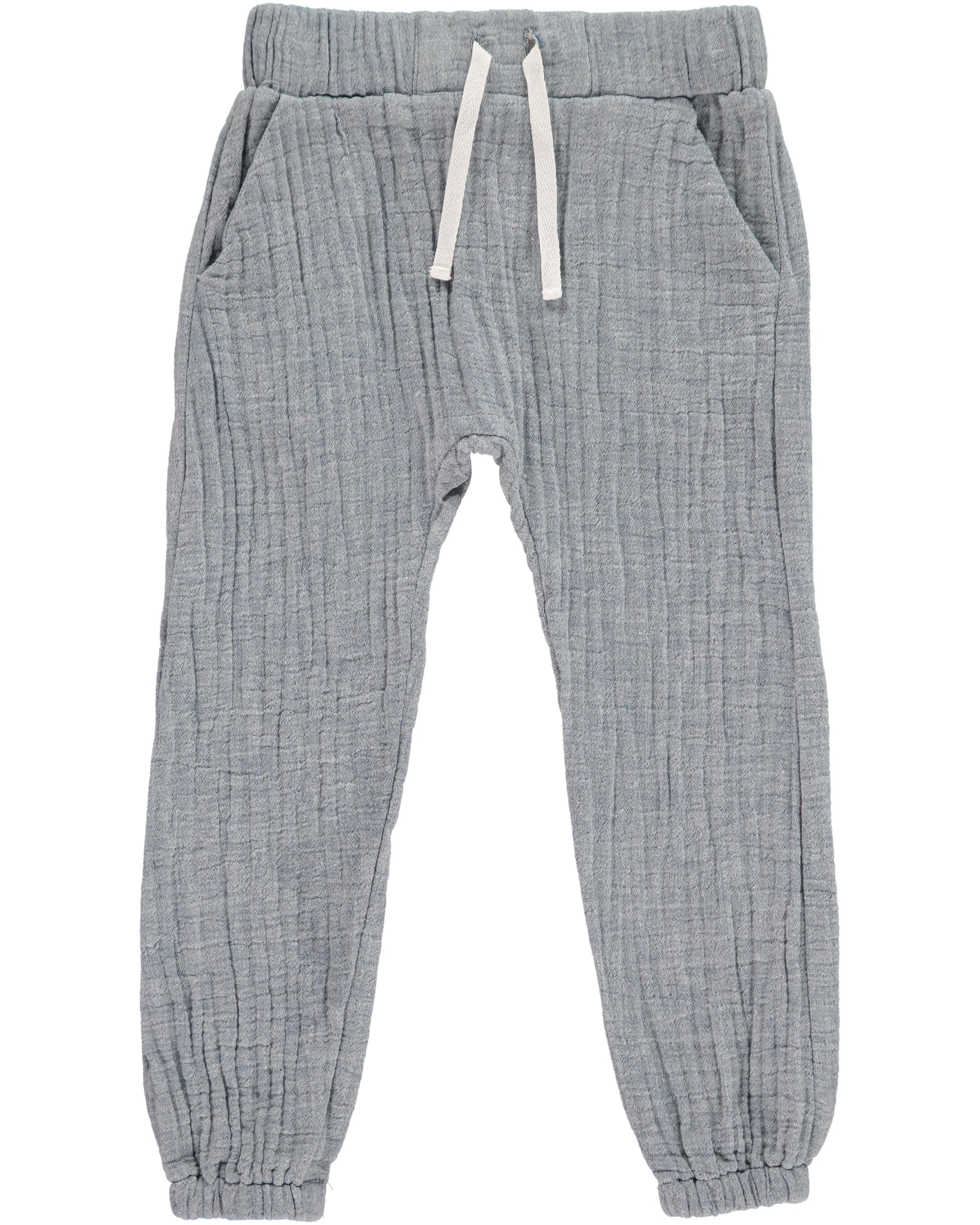 Heathered blue gauze cotton jog pant style trousers. Elasticated waist and cuff with fake tie cord and pocket.