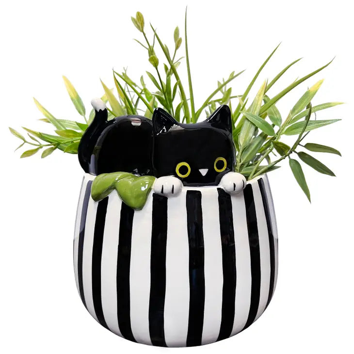Art imitates life with this adorable peek-a-boo kitty planter! Kitties love plants and this ceramic planter features a frisky, black feline, really channeling its jungle panther ancestors- as it curiously peeks out from your favorite plant-ready to pounce!