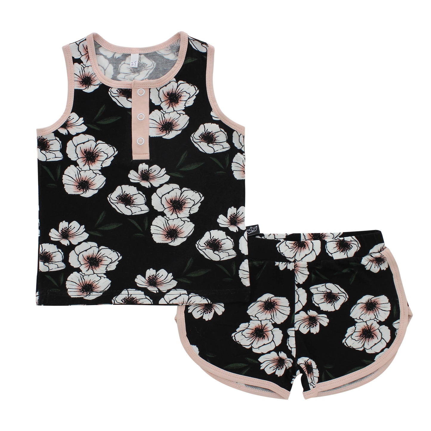 Retro track shorts with contrast trim and a racer back tank make for an easy breezy set your kiddos will want to wear all day and all night.