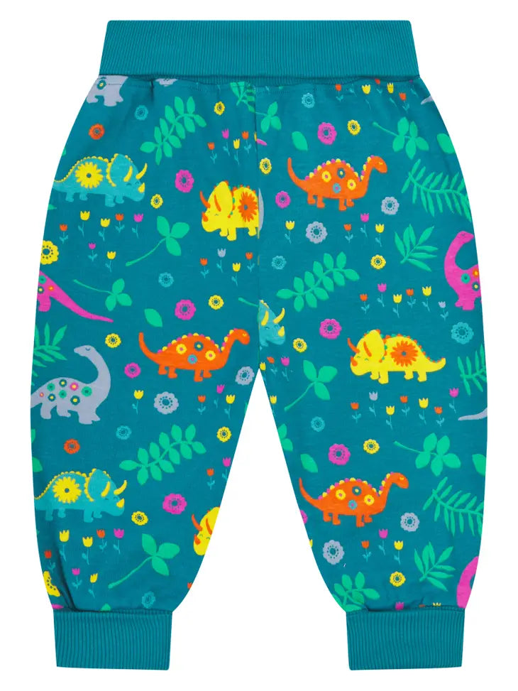 Our super comfy pull-up trousers are back and better than ever! They are a must-have for baby and toddler. Our pull-ups are made from soft but durable organic jersey cotton. They feature ribbed fold-over cuffs at the ankle and a fold-over waistband for a snug long-lasting fit. Our clothing is designed to fit over both cloth and disposable nappies. These Piccalilly classics come in this adorable dinosaur print. A teal blue base featuring a striking dinosaur print with pops of vibrant colour. Team with a bodysuit or top to create a coordinating outfit.