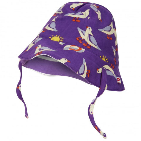 A reversible sun hat for baby. It features a sunny all-over seagull print with flip-flops, buckets and suitcases. Our hat has a purple base, baring our all-over seagull print on the one side and white stripes on the reverse. This super cute hat is made from soft double layer cotton jersey. It has a strap that fastens under the chin. Perfect for protecting little heads on their adventurous days in the sun. Available in size Small, Medium and Large.