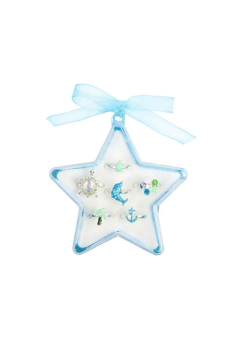 The deluxe water themed ring set features 6 adjustable rings. Set Includes: a baby green turtle, a larger turtle with gems, a glitter blue dolphin, gem flower, glitter palm tree and a glitter anchor in a blue star shaped keepsake box with a blue organza ribbon.