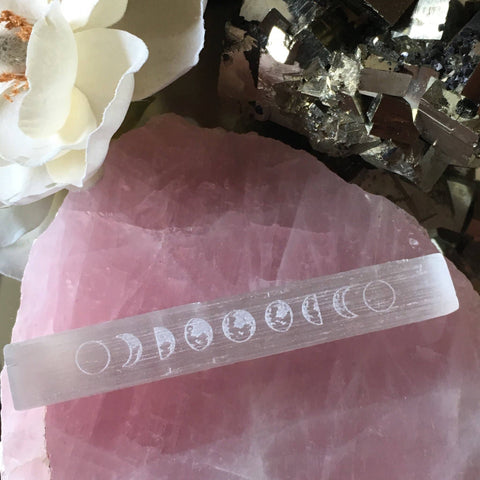 These rough selenite wands highlight the natural beauty of the this stone. Engraved with the moon phases to assist in one's connection to the Lunar Cycle. This wand measures roughly 4"x .5"