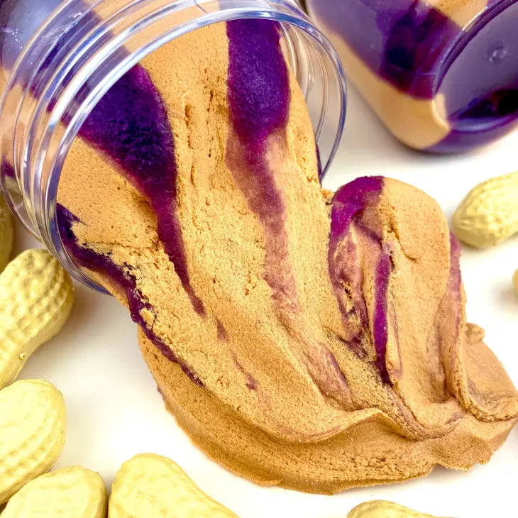 Slimey Goober Grape is a thick & creamy concoction that feels so soft and decadent in between your fingers. This Slime is one of our most labor intensive Slimes we make since we take our time to add the perfectly spaced "Grape Jelly" ribbons to each jar. Each Slimey Goober Grape is scented with a perfect blend of salty peanut butter and sweet grape jelly which adds to the fun and nostalgic Slime experience one would expect from our company!