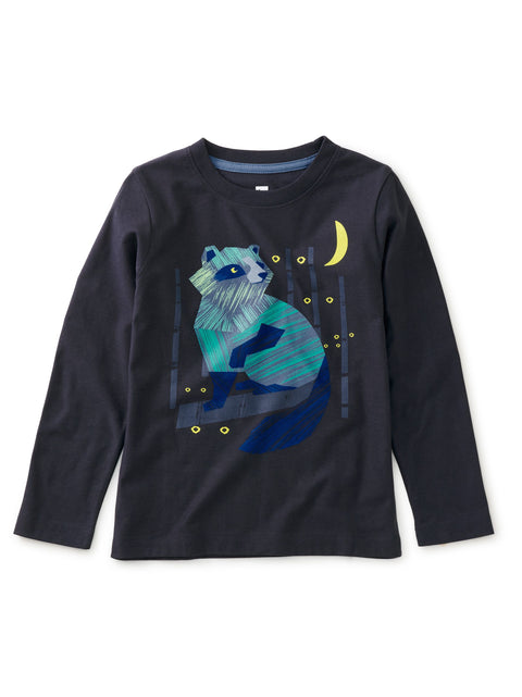 The adorable tanuki is a wild canid species native to Japan that is related to wolves, foxes, and domestic dogs. We love this one posed under the moon. Crafted from 100% soft cotton jersey.