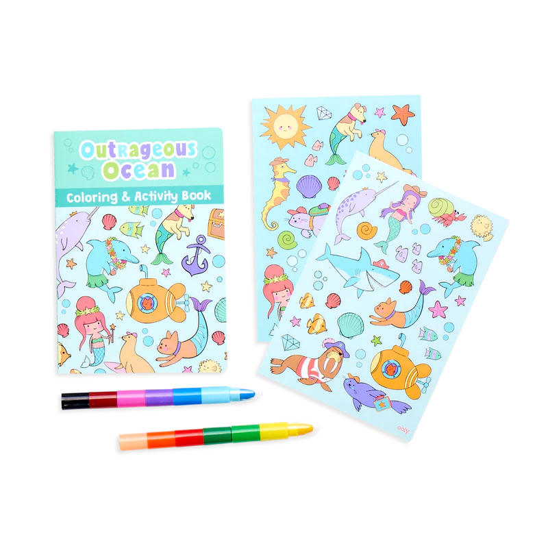 Dive in and experience the trip of a lifetime with the Outrageous Ocean Mini Traveler Coloring and Activity Kit. No matter your destination, your little adventurer will be endlessly entertained with all this travel sized activity kit has to offer - including an ocean activity book, 2 stackable crayons, and 2 wet and wild undersea themed sticker pages..