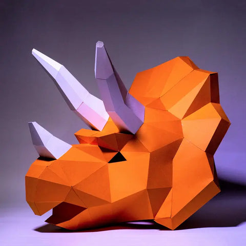 PRE-CUT and PRE-FOLDED PaperCraft. Who says dinosaurs are extinct? Not if you make believe! Transform yourself into a prehistoric dino by slipping on this Jurassic 3D triceratops mask made from orange craft paper. Use our PaperCraft masks for costume parties, performances, special events, or just for plain fun. They can also be used as lamp covers, hung on walls, or however your creative mind can think! Paint them, colour on them, put your cat in them, or throw sparkles on them… They won’t mind.