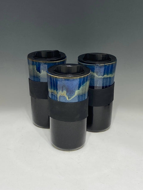 This set of waterfall lidded travel mugs. The glazes have a waterfall affect. All glazes are food safe. The lid is made and manufactured in the US; it is a part unto itself and is BPA free; it can be microwaved and even put in the dishwasher. It is leak proof with a seal and locking mechanism. The mug is also microwave and dishwasher safe. The mugs fit in any standard car cup holder and hold 16 oz. Food safe, microwave save (lid/sleeve/mug), and dishwasher safe.
